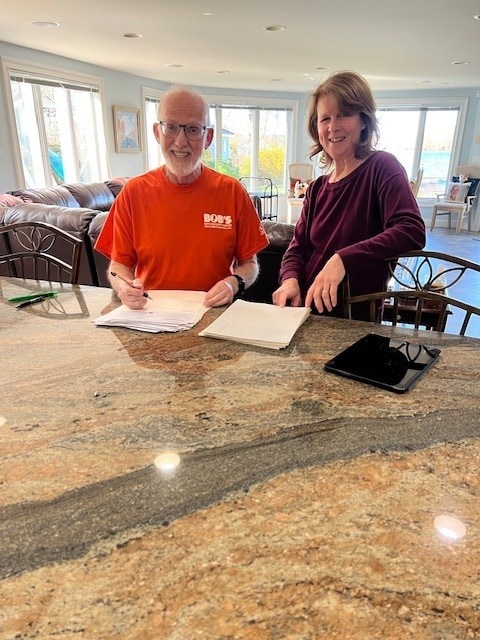 Bob Kaufman, president emeritus and co-founder of Bob’s Discount Furniture signs 214, $1,000-checks for food pantries this year. Also pictured in Kathryn Pianta, Lead Foundation Administrator.