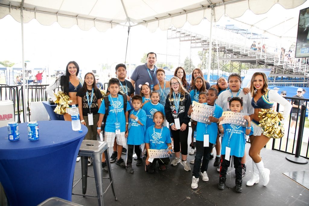 Boys & Girls Clubs of Long Beach members pose with LA Chargers players and cheerleaders at VIP training camp event in August 2018