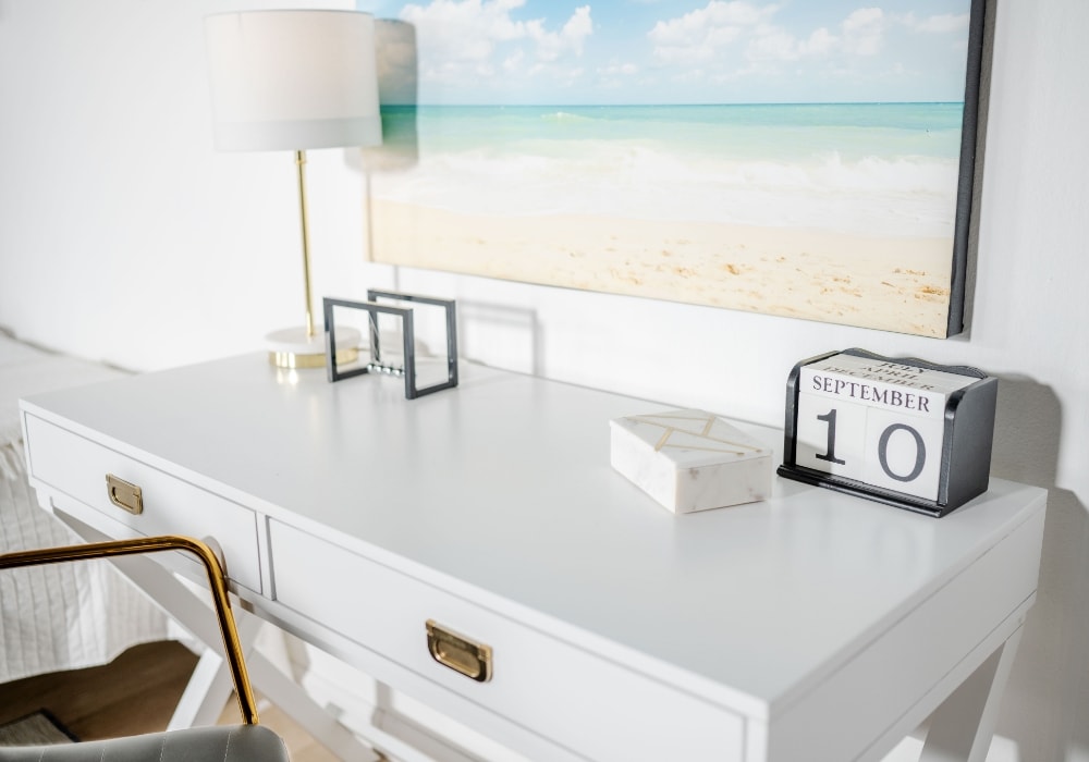Cord organizers, desk drawers, and cabinets keep your workspace looking tidy. Clean surfaces can help reduce distractions and create a clear headspace for work.