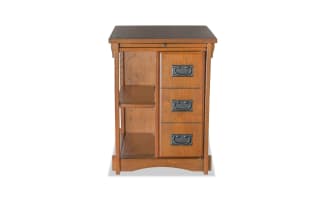 My Christy Cabinet Side Table puts the 'fun' in functional! This cabinet side table really has it all- two open shelves, a tall cabinet compartment, a pull-out ledge on top and even a slot for magazines on the back. The traditional handle pulls and curved carving adds even more style to the super functional design!