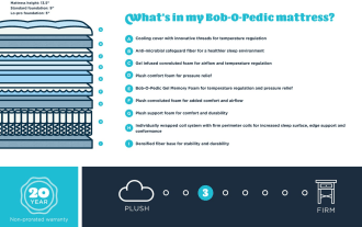 Mattress Layers | Quilted cooling cover, Anti-micorbial safeguard fiber, Gel infused convoluted plush foam, Plush support foam, Plush convoluted foam, Bob-O-Pedic Gel Memory Foam, Individually wrapped coil system with firm perimeter coils, Densified fiber base |