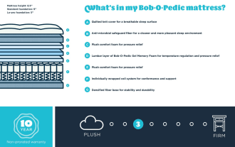 | Mattress Layers | Anti-microbial safeguard fiber, Densified fiber base, Firm comfort foam, Individually wrapped coil system, Lumbar layer of Bob-O-Pedic Gel Memory Foam, Plush comfort foam, Quilted knit cover |