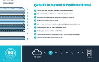 | Mattress Layers | Quilted cooling cover, Anti-microbial safeguard fiber, Gel infused convoluted plush foam, Plush support foam, Plush convoluted foam, Bob-O-Pedic Gel Memory Foam, Foam encased individually wrapped coil system, base foam |