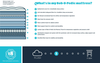 | Features | <ul class='product-features_list'><li class='product-features_list_value'><span class='product-features_list_value_info'>Adjustable Height Legs</span></li></ul><ul class='product-features_list'><li class='product-features_list_value'><span role='tooltip' tabindex='0' tooltip='Bob-O-Pedic Gel Memory Foam features state-of-the-art temperature sensitive memory foam that is infused with gel for temperature regulation and pressure relief.' class='product-features_list_value_aslinkdotted_line'>Bob-O-Pedic Gel Memory Foam</span></li></ul><ul class='product-features_list'><li class='product-features_list_value'><span role='tooltip' tabindex='0' tooltip='If your new mattress/foundation is delivered via BOBtastic White Glove Delivery, the team will remove your old mattress/foundation! Old mattresses/foundations must be in safe and sanitary condition. This service is not available for mattresses/foundations that are delivered via BOBtastic Threshold Delivery, No-Contact Delivery and FedEx.' class='product-features_list_value_aslinkdotted_line'>BOBtastic Mattress Takeaway</span></li></ul><ul class='product-features_list'><li class='product-features_list_value'><span role='tooltip' tabindex='0' tooltip='I truly care what goes into making all of my furniture and that’s why every product that contains CertiPUR-US® foam has been tested and certified by independent laboratories. These products include all of my mattresses and most upholstery items. You can rest assured knowing that the foam has been put through a series of tests to ensure content, indoor emissions and durability meet the strict standards of the CertiPUR-US® program. CertiPUR-US® certified foams have low emission (VOCs) for indoor quality; are made without prohibited phthalates; ozone depleters (no CFCs); mercury, lead or heavy metals; formaldehyde and without PBDE flame retardants and have been tested for durability and performance.' class='product-features_list_value_aslinkdotted_line'>CertiPUR-US®</span></li></ul><ul class='product-features_list'><li class='product-features_list_value'><span class='product-features_list_value_info'>Easy Delivery</span></li></ul><ul class='product-features_list'><li class='product-features_list_value'><span class='product-features_list_value_info'>Platform/Storage Bed Compatible</span></li></ul> |