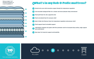 | Mattress Layers | Stretch knit cover with copper threads, Anti-microbial safeguard fiber, Plush quilt foam, Plush convoluted comfort foam, Bob-O-Pedic Gel Memory Foam, Plush support foam, Individually wrapped coil system with firm perimeter coils, Base foam. |